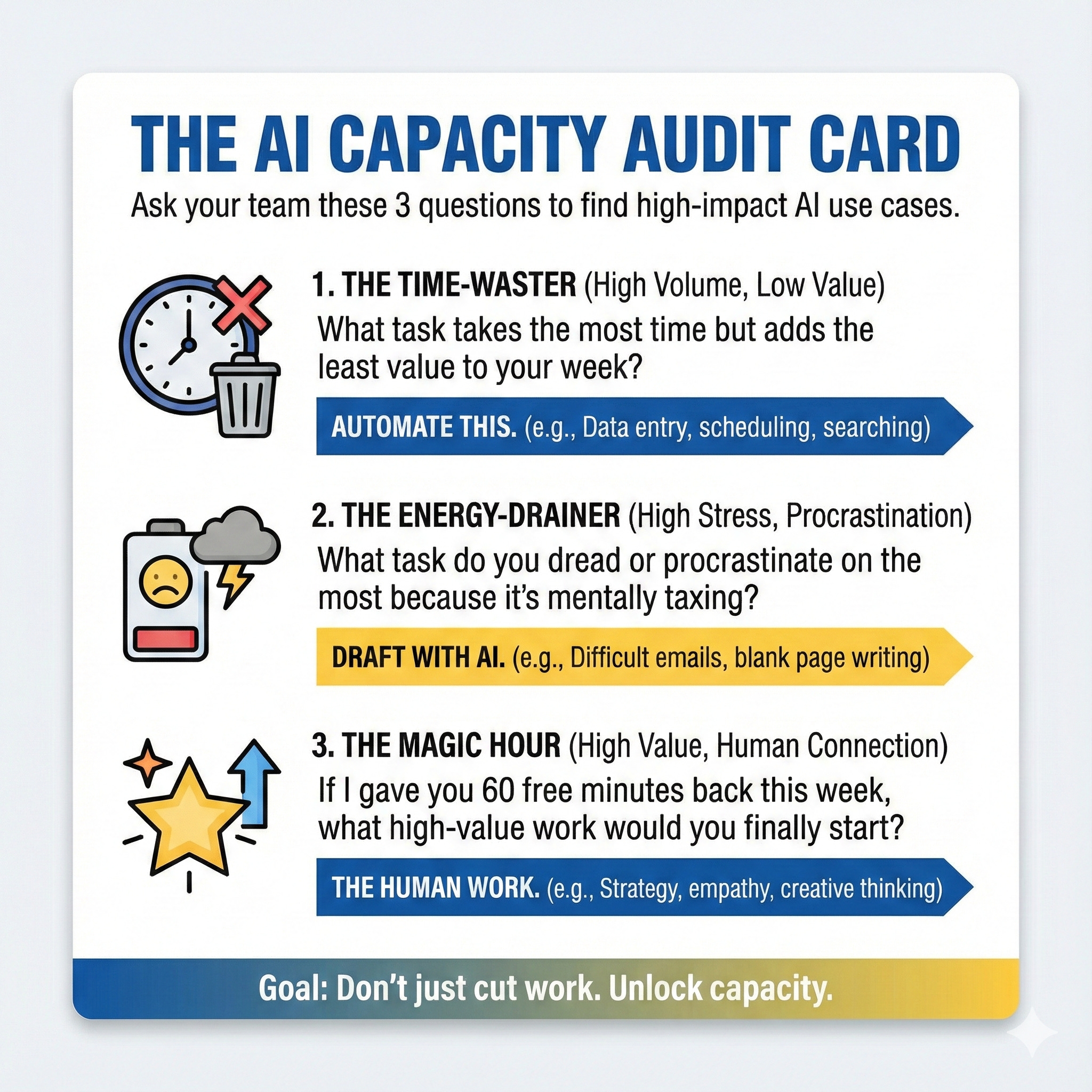 We are not using AI to cut headcount. Nonprofits like Furniture Bank have NEVER had enough people. We have too much demand and not enough capacity. My goal is to use AI to remove work that wastes your time so you can do more work that only you can do.