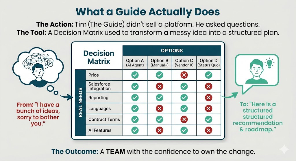 Guides come first. We are investing in people who can turn friction into decision-ready requests. AI Cred and training will point at them first.