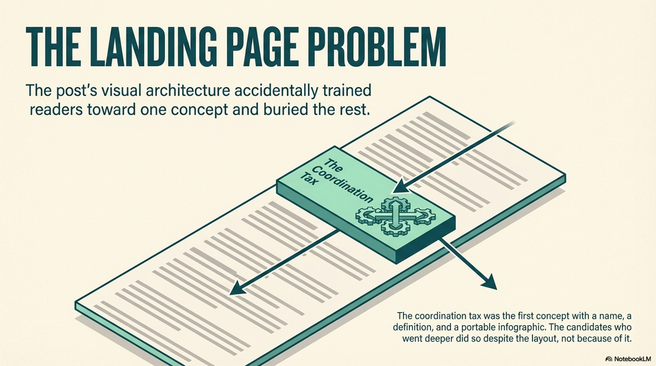 This is not a complaint about the candidates. It is an honest accounting of what I built. The post’s architecture trained readers toward one concept and made every other concept harder to reach. The people who went deeper went deep despite the layout, not because of it.