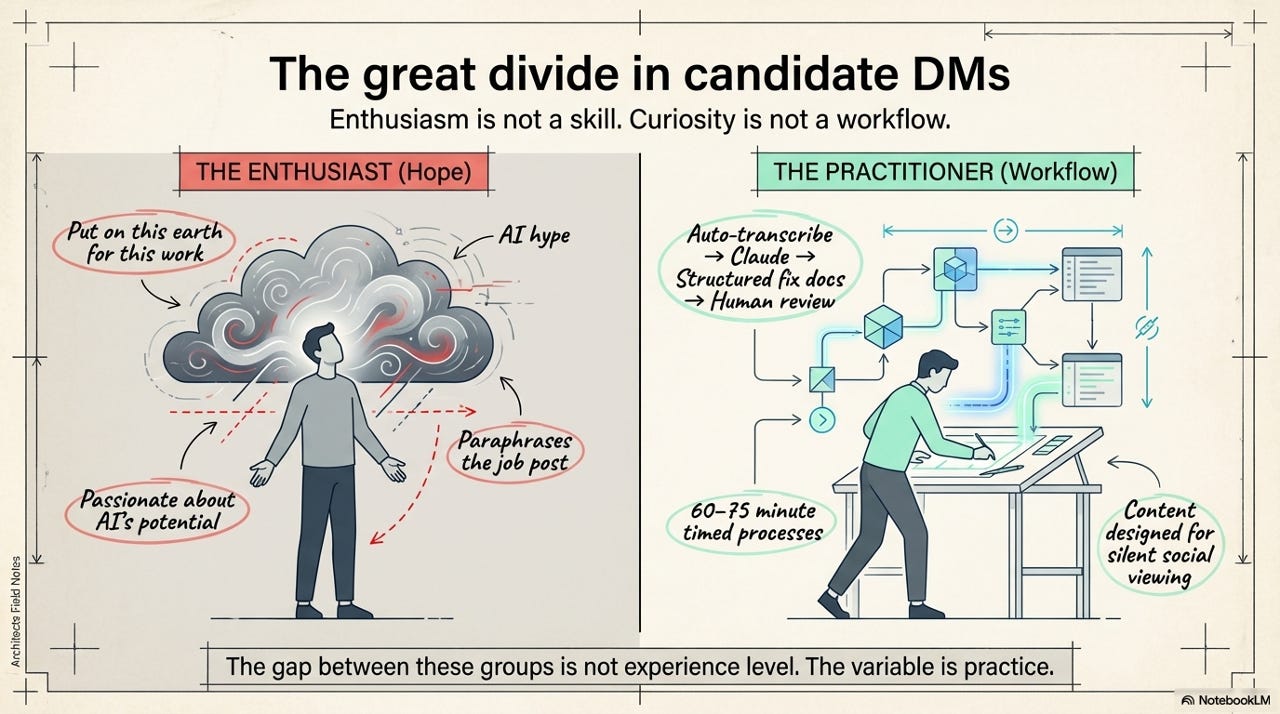 The first group wrote about potential. They talked about being passionate, about believing AI would reshape design or analytics, about being “quite proficient” with AI tools. Some referenced university courses. Some paraphrased the post’s own arguments back as their pitch. One candidate said they were “put on this earth” for this work. The enthusiasm was real. The evidence was not.