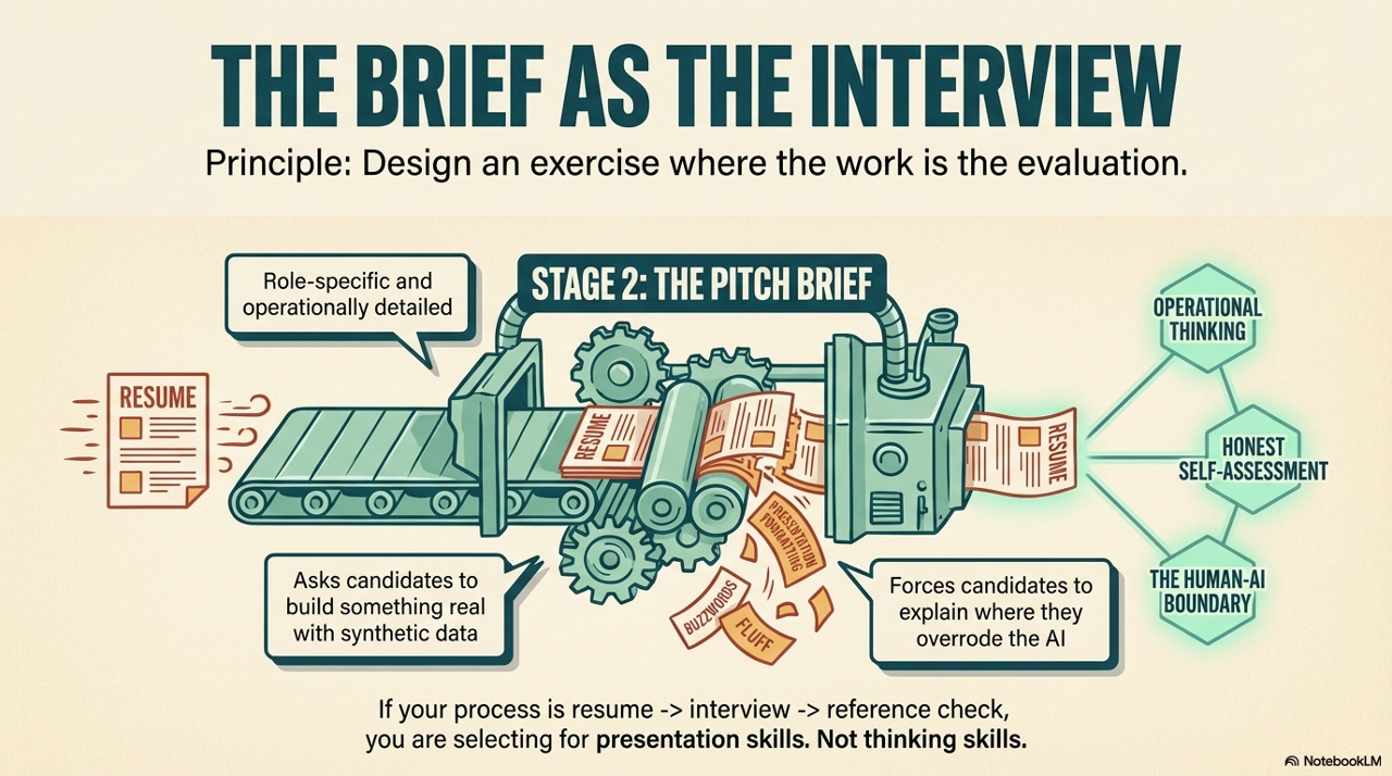 I am not going to share the brief or its questions. The filter needs to keep working. But the principle is transferable: design an exercise where the work is the evaluation.