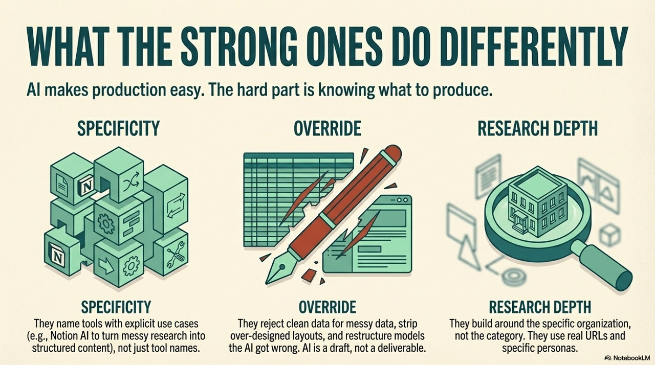 The second thing is override. The strongest candidates did not just use AI output. They corrected it. One rejected clean synthetic data because real operational data is messy, and deliberately introduced noise to make the exercise realistic. Another stripped down an over-designed multi-chart layout into a single focused page because the AI’s version was trying to impress instead of inform. Another restructured a risk model from binary to three-part because the AI’s version was too simple to be useful. These are people who treat AI as a draft, not a deliverable.